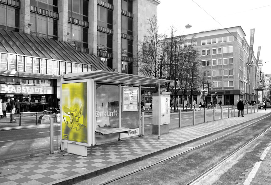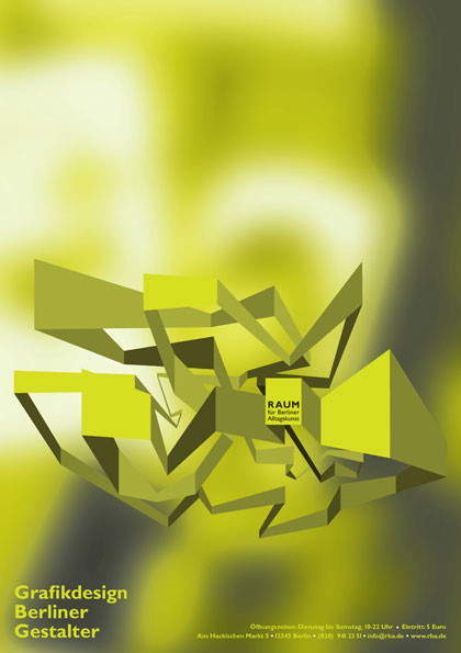 Der Hintergrund besteht aus einem stark weich-gezeichneten Foto, dessen Farbgebung sich im Spektrum der Hausfarben befindet. Die Raumschleife, die den immer wieder wechselnden Freiraum spielerisch visualisieren soll, wird fessellos und immer wechselnd erstellt und angeordnet. Hierbei unterstützen die Farben stets die perspektivische Wirkung .
