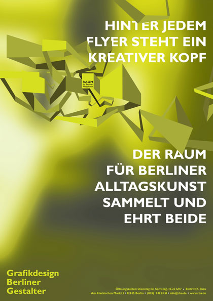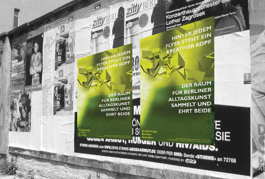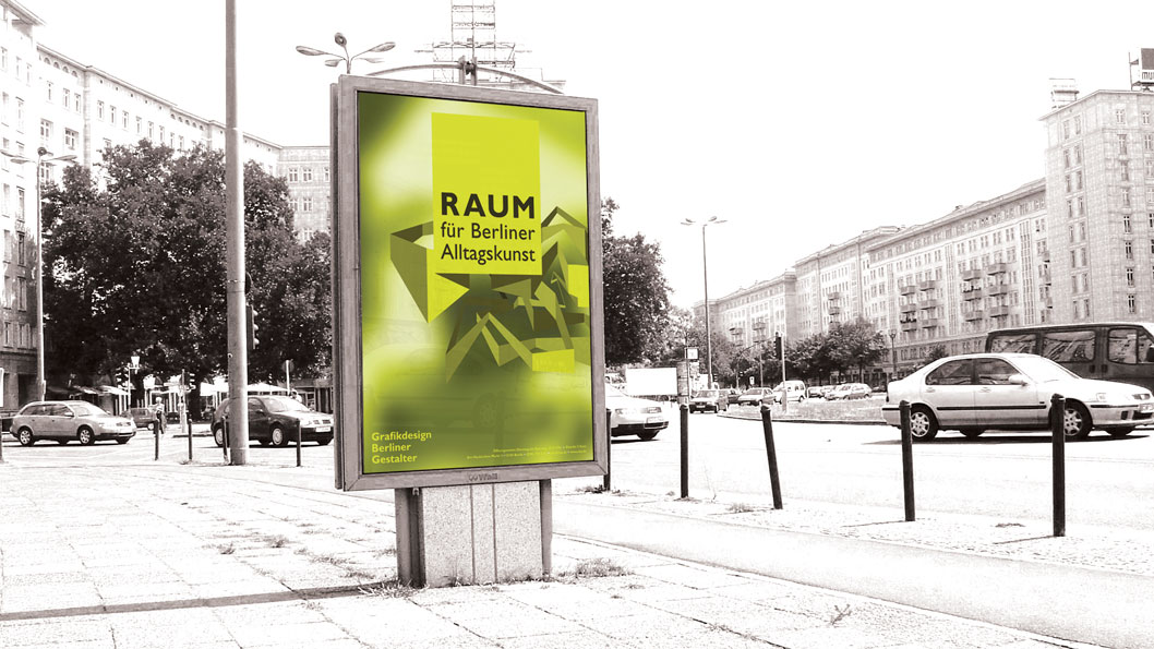 Die Offenheit und Unbefangenheit jedweder Gestaltung gegenüber soll sich auch in dem Design des »Raumes für Berliner Alltagskunst« äußern. Die sanften Grünabstufungen des Hintergrunds, in Kombination mit der konturreichen Raumschleife bilden einen interessanten Formenkontrast.